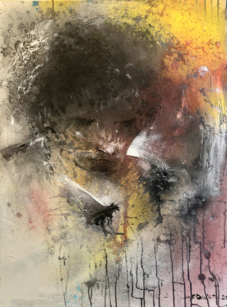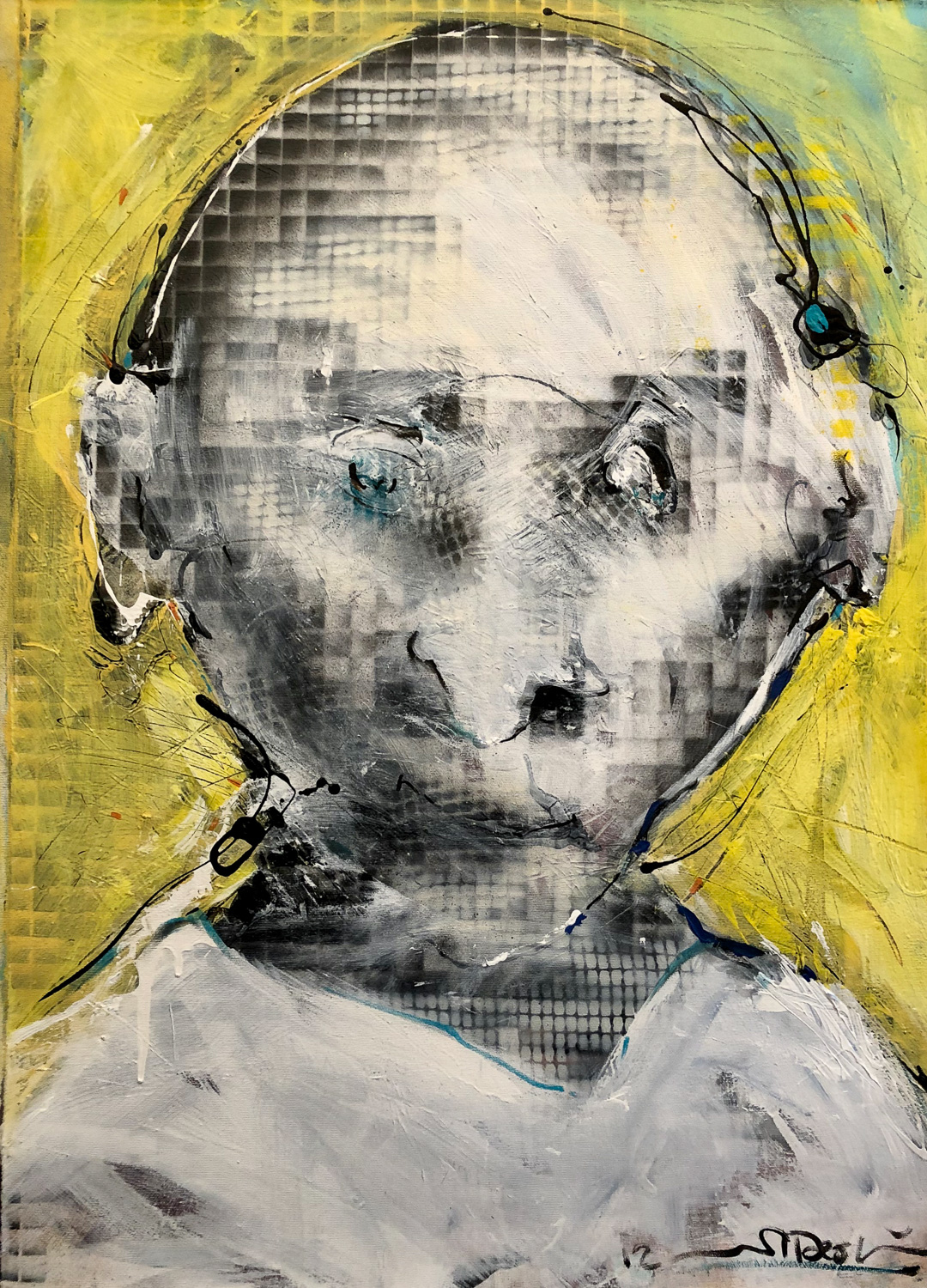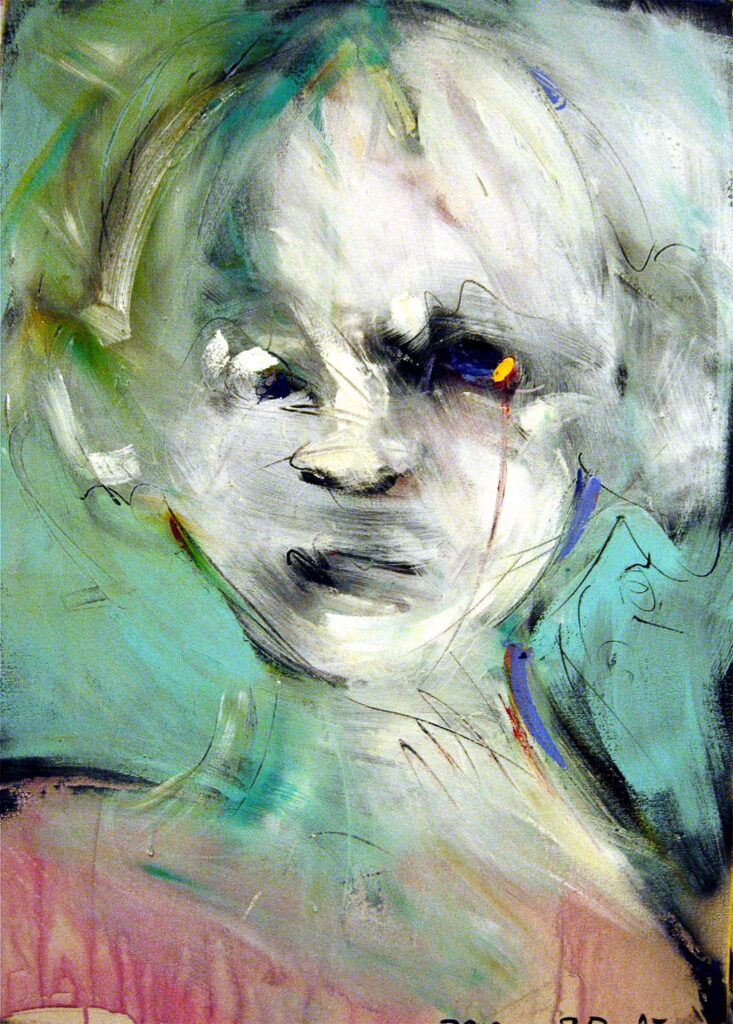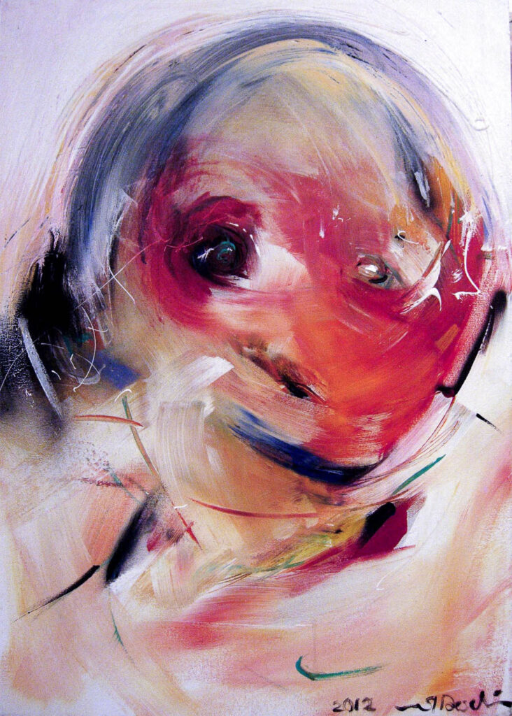 Souvent espiègles, ces petits êtres souriants impriment leur image avec des mines joyeuses, avenantes. D’autres fois, puisant dans les décombres de mes propres blessures, ces personnages émergent en êtres torturés, mélancolique, blessés par la vie. Donnant toujours priorité à l’inconscient, je peins surtout des visages de personnes n’existant pas dans la réalité.
