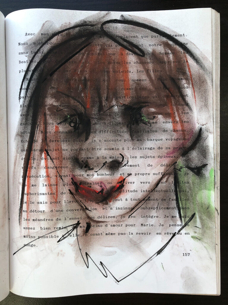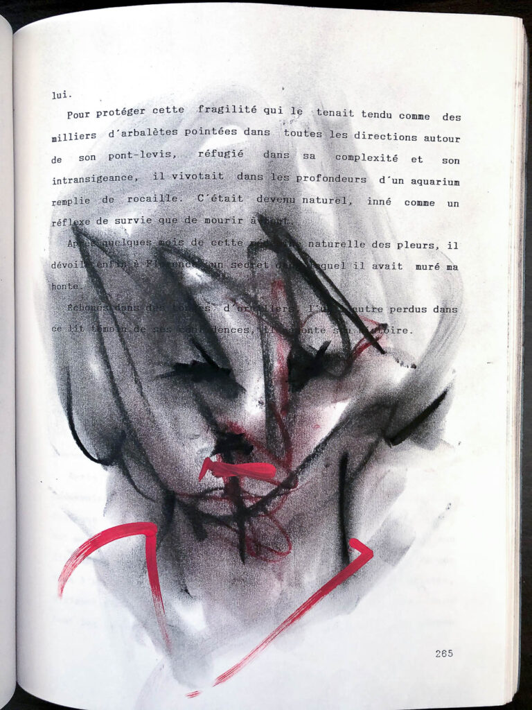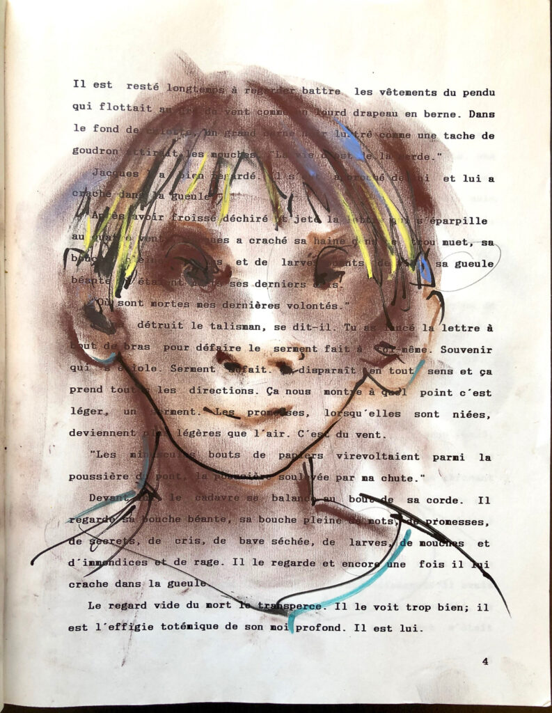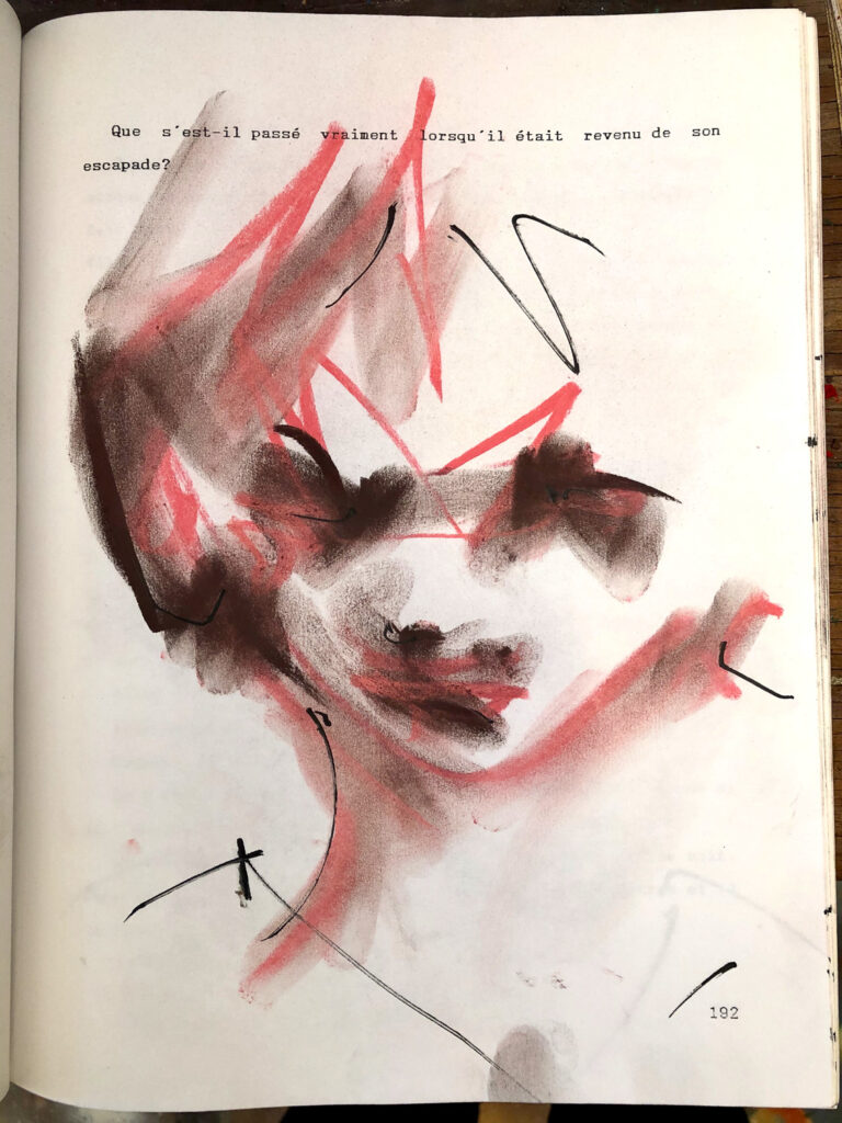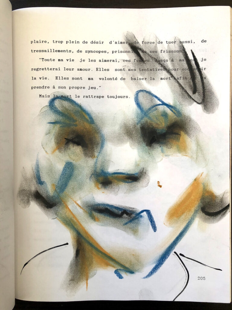 Ces dessins au pastel sec sont apparus au jour le jour du premier mois de réclusion forcé imposé par la COVID. Ils existent à l’endos des pages du premier jet de mon manuscrit qui donna naissance à mon roman « LE BÂTISSEUR D’ÉPAVES »