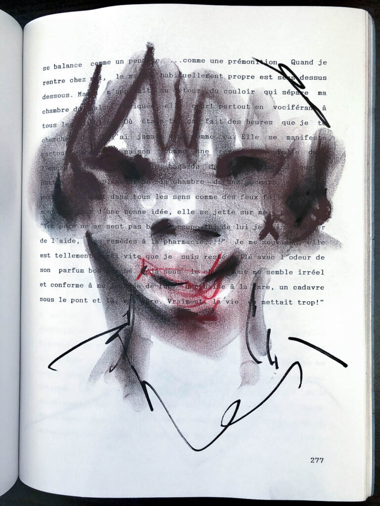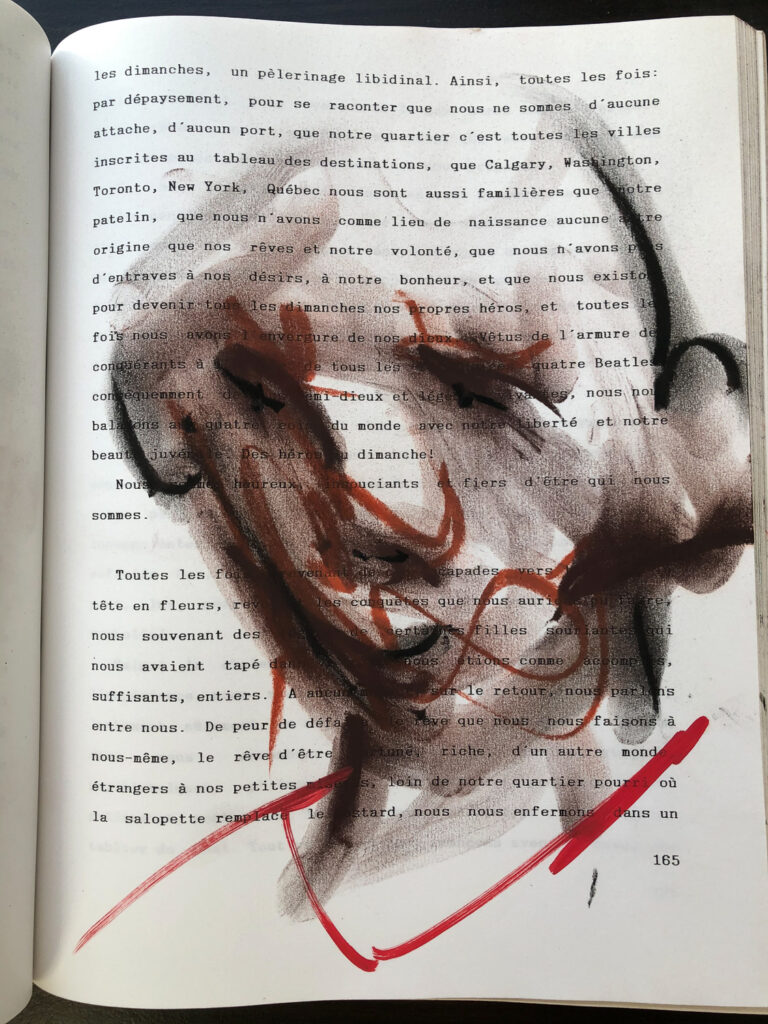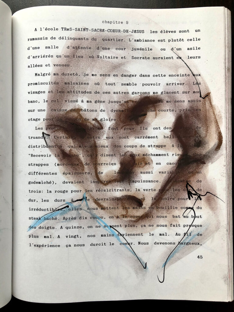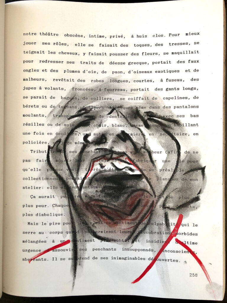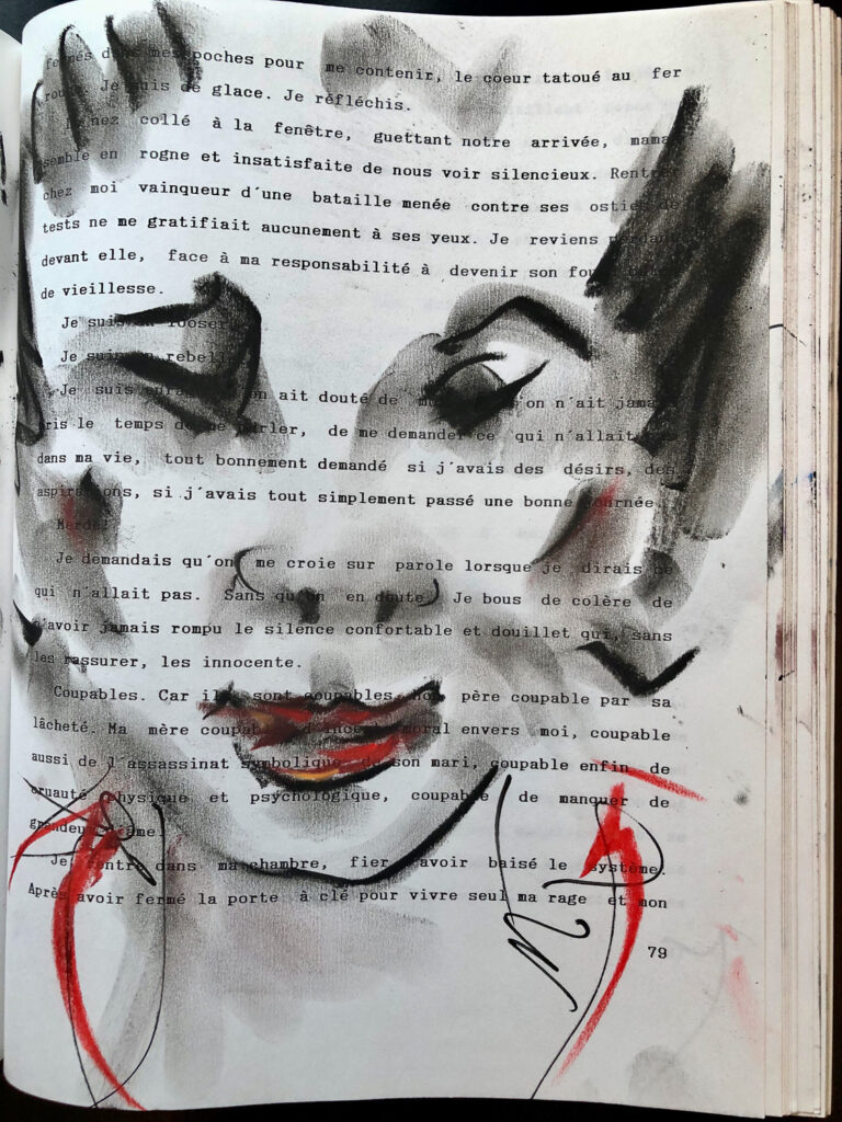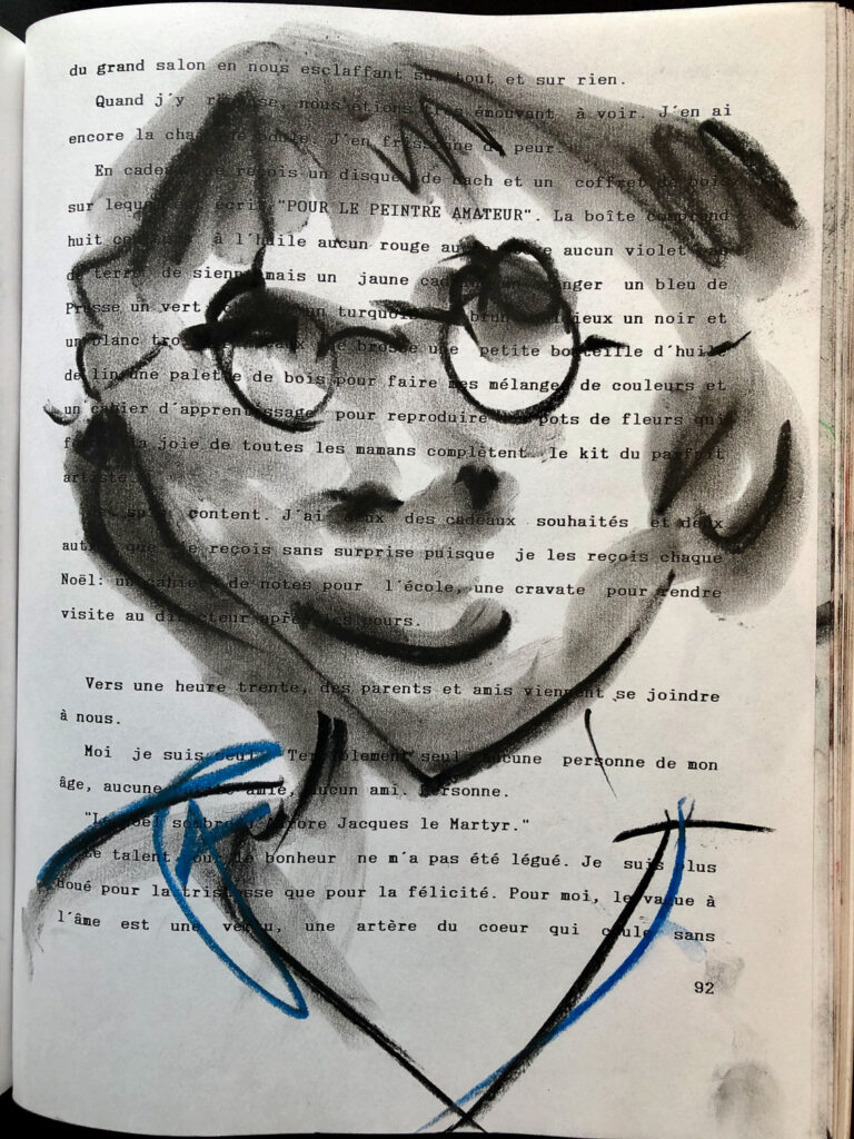 Ces dessins au pastel sec sont apparus au jour le jour du premier mois de réclusion forcé imposé par la COVID. Ils existent à l’endos des pages du premier jet de mon manuscrit qui donna naissance à mon roman « LE BÂTISSEUR D’ÉPAVES »