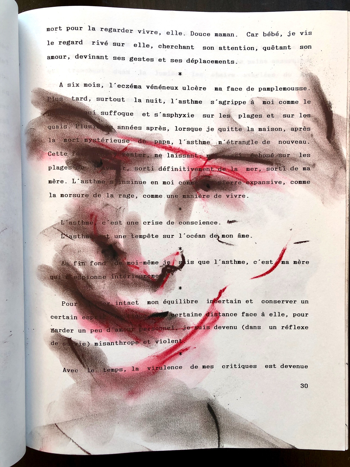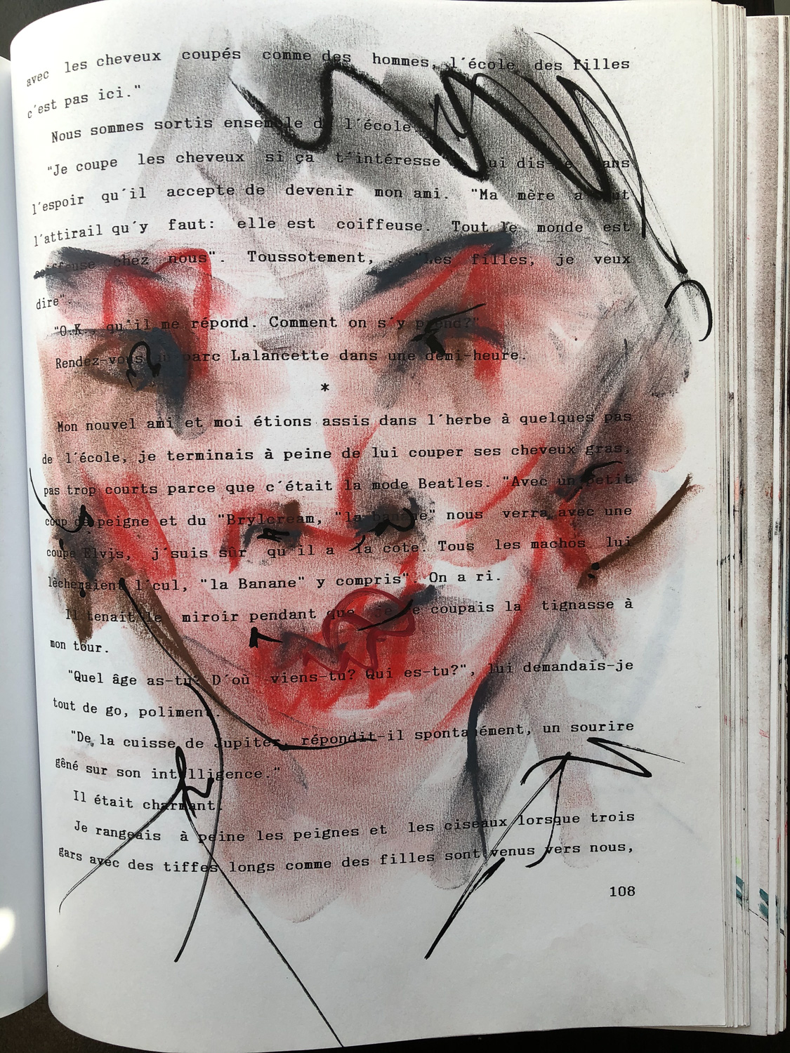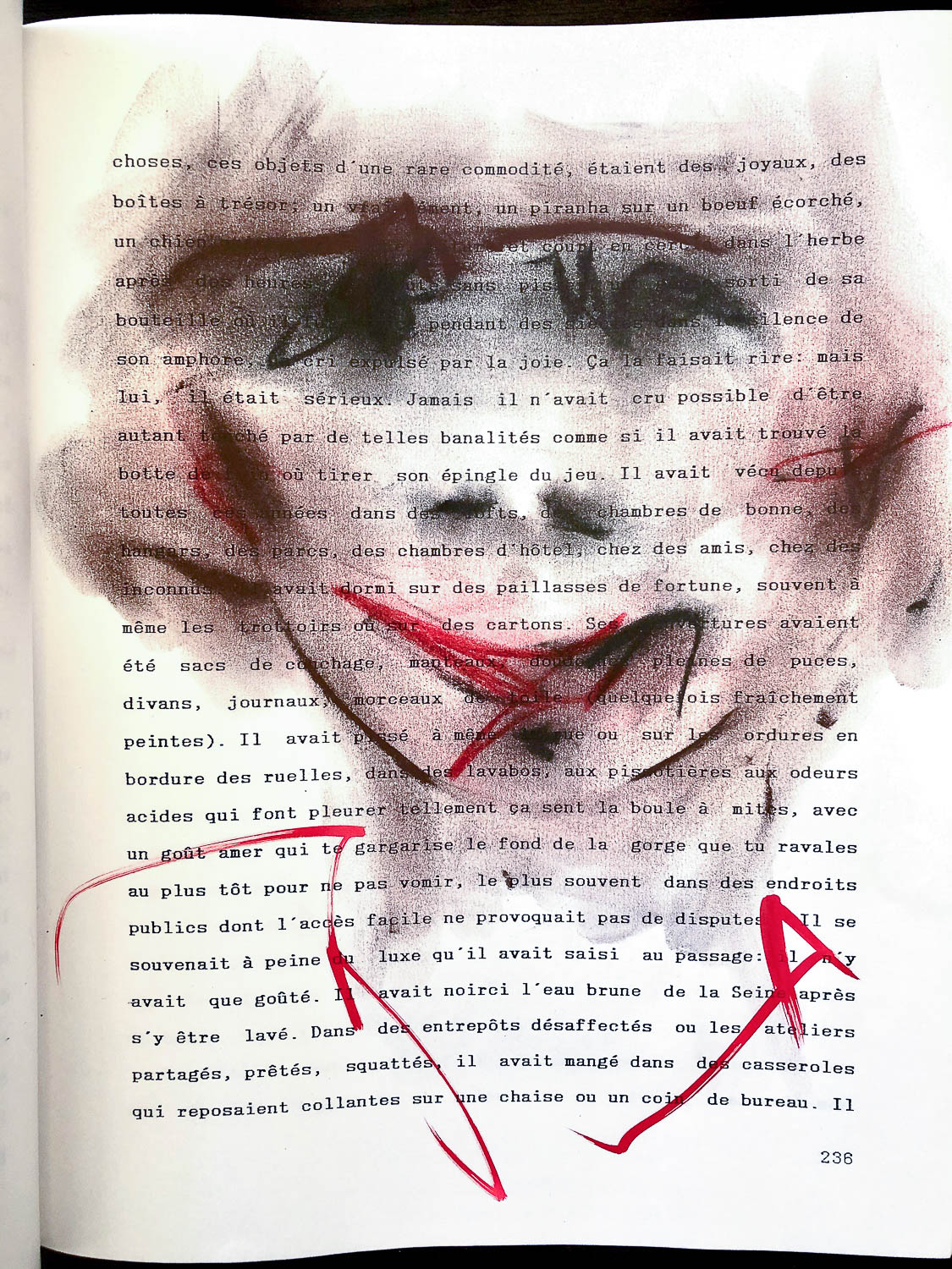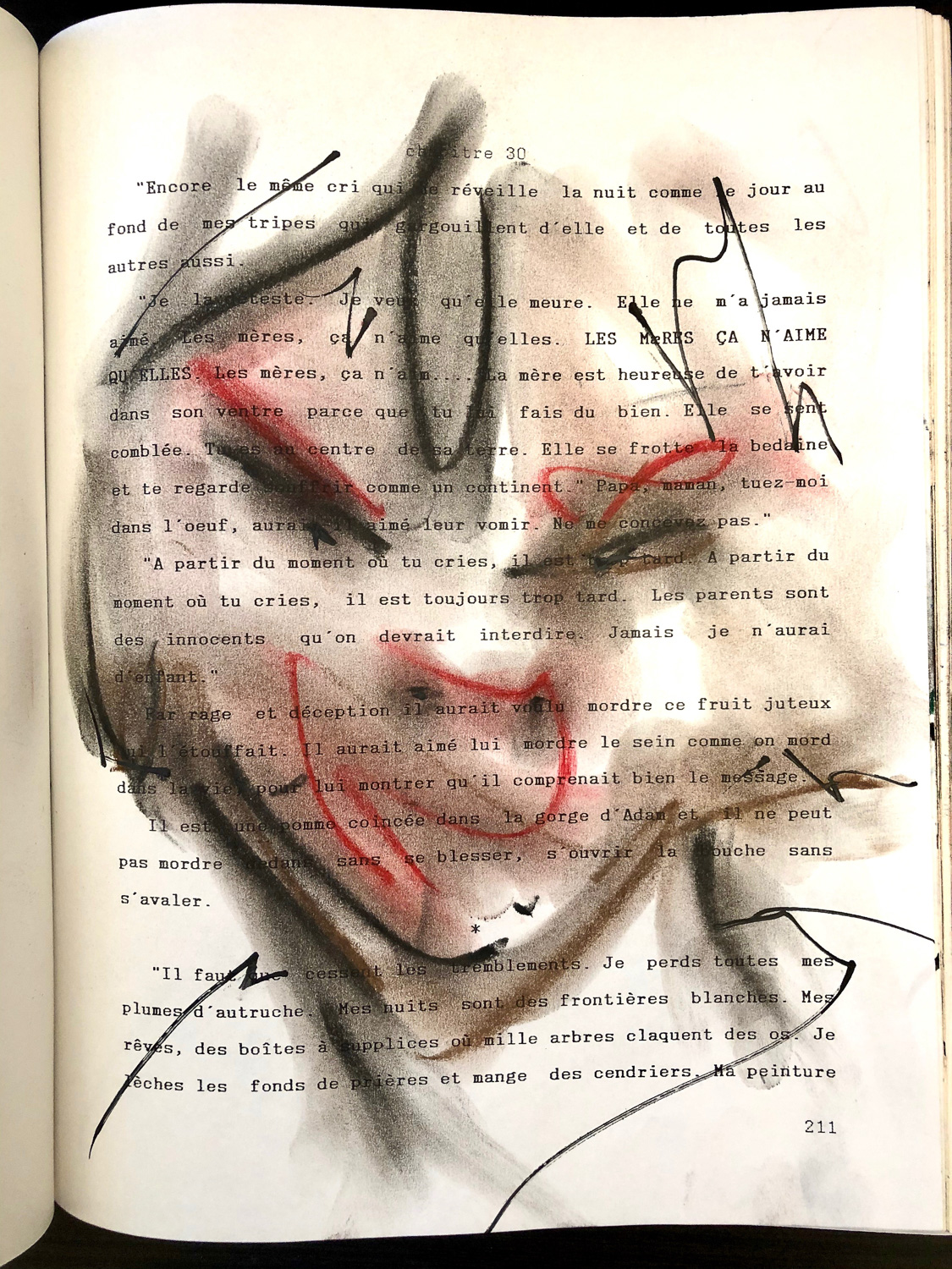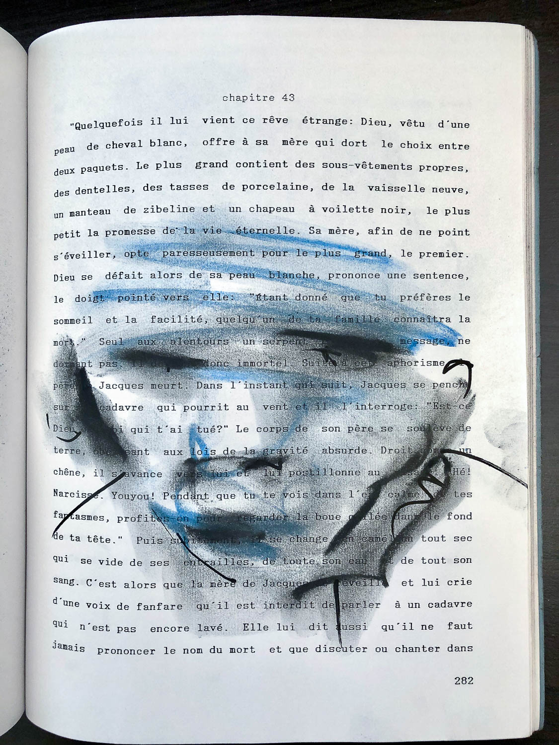 Ces dessins au pastel sec sont apparus au jour le jour du premier mois de réclusion forcé imposé par la COVID. Ils existent à l’endos des pages du premier jet de mon manuscrit qui donna naissance à mon roman « LE BÂTISSEUR D’ÉPAVES »