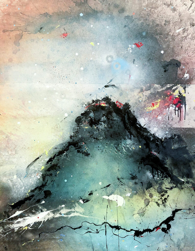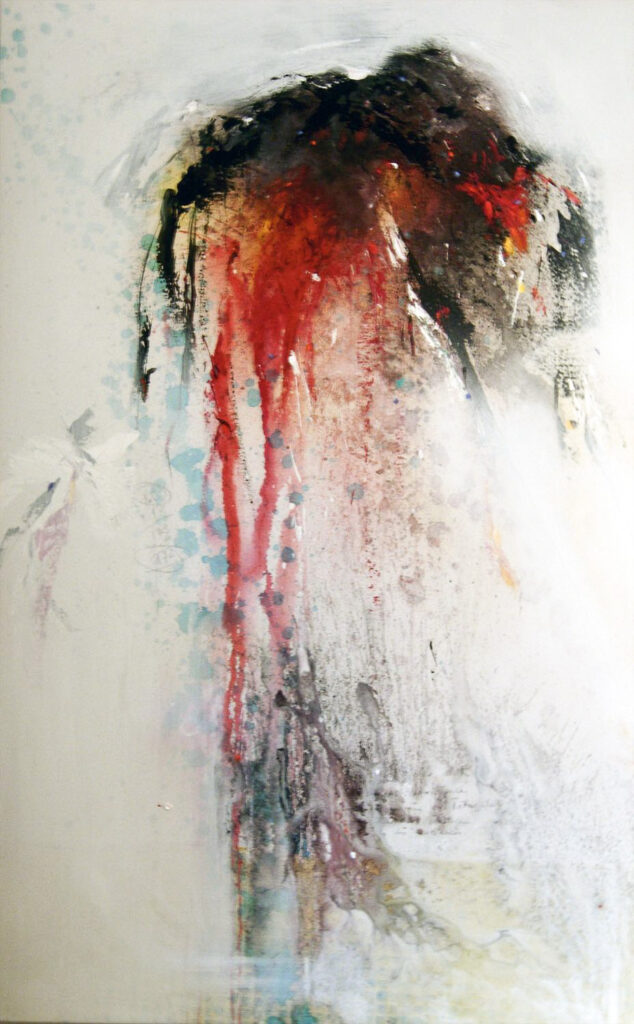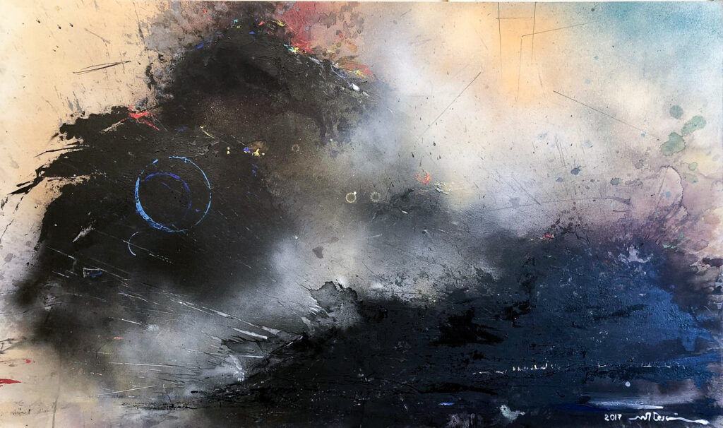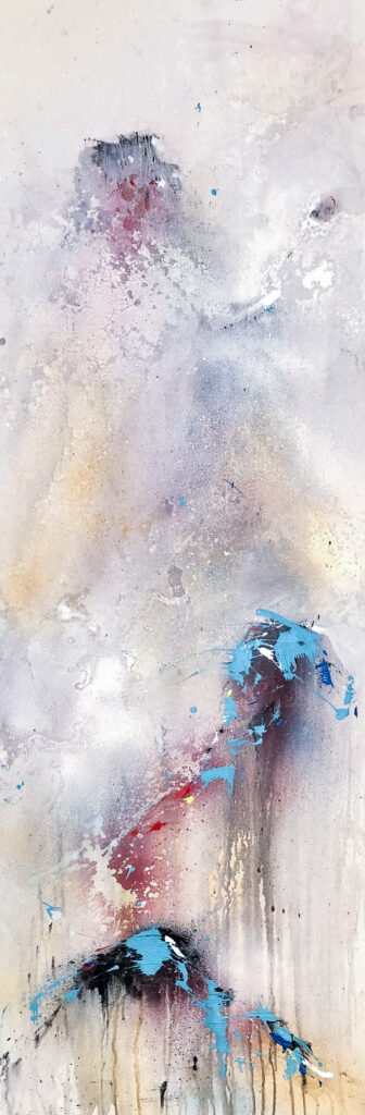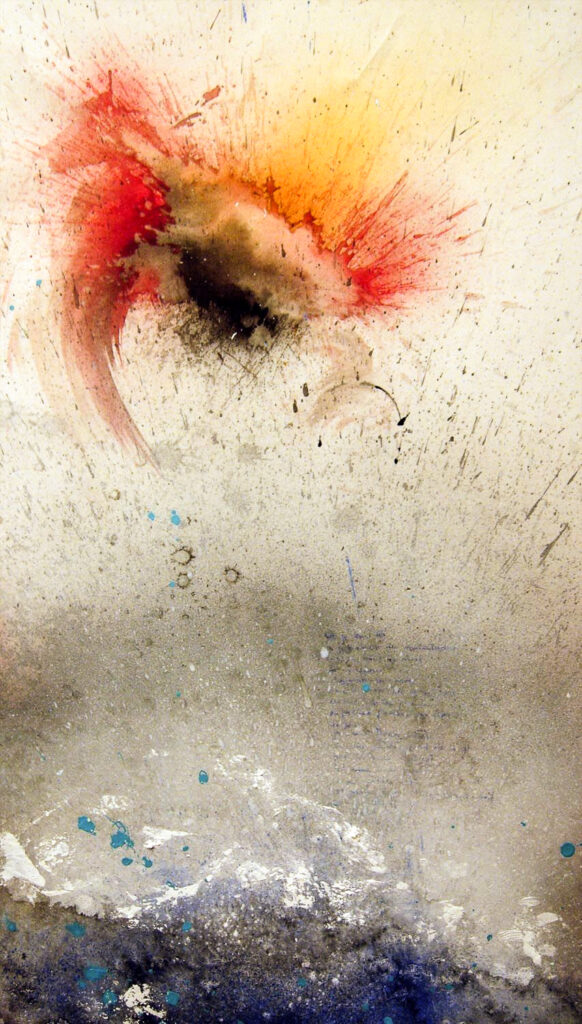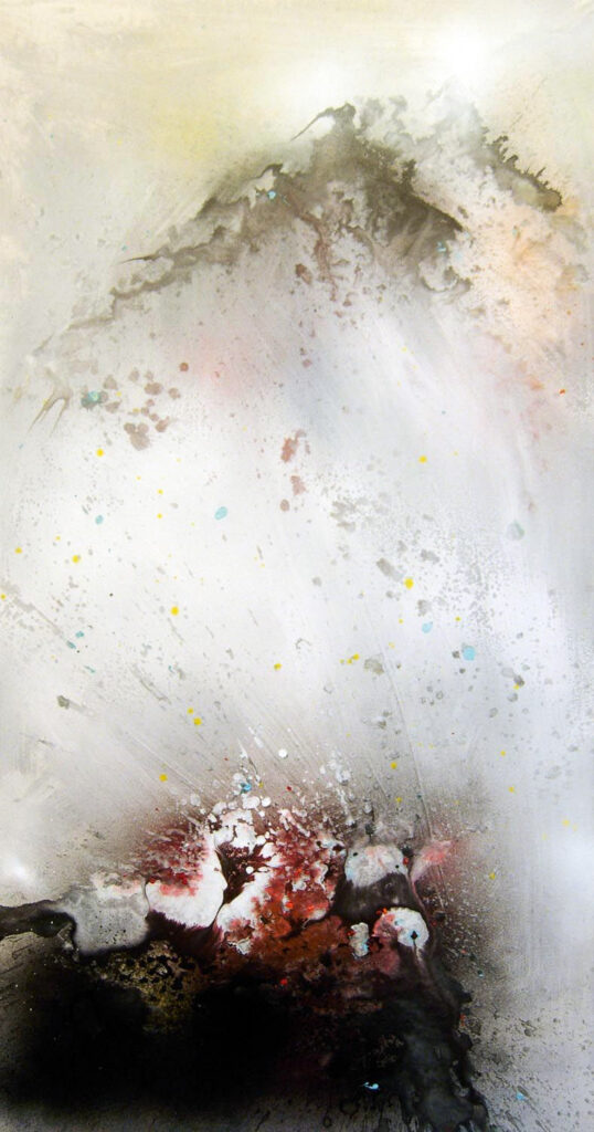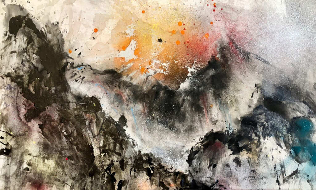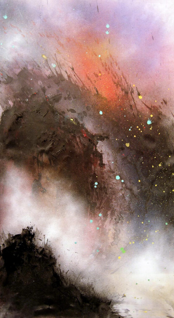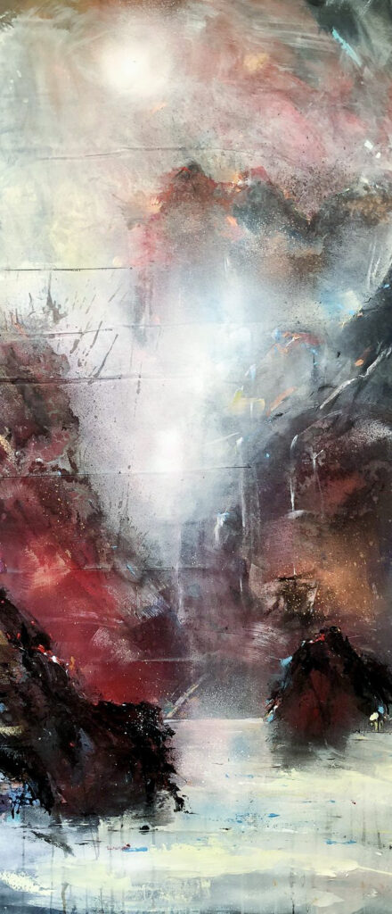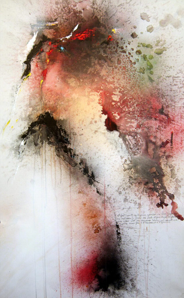 Les tableaux « SANSUI » veulent posséder l’esprit de l’eau et recréent, – par les pulsations sanguines qui motivent ce lien – la vivacité de tous ses mouvements, la manière dont les vagues se heurtent ou se succèdent, dont elles s’incarnent en de multiples formes fantastiques, tantôt agitées, tantôt apaisées. Ils mettent en lumière l’expérience directe et intuitive et communiquent par-delà les mots et les images pour faire ressentir le mouvement de la vie et la force spirituelle contenue dans chaque chose. Ils s’imprègnent de l’odeur et des sons que l’on retrouve le long des cours d’eau, des fleuves et des océans, de la vie en mouvement. Par les vents et les nuages sonder les mutations imprévisibles d’un lieu ; par l’agencement des pics et des falaises déchiffrer le secret caché qui avive le souffle dynamique et maîtriser la forme et l’esprit ; capter la vie qui se forme et s’éveille, s’ouvre, se détourne, s’incline ou se fane; saisir les secrets qui l’animent. Voilà autant de sujets qui m’inspirent. La métaphore fait partie intégrante de la pensée secrète qui les compose. Dans le plus grand abandon, le pinceau suit les mouvements giratoires du sang qui coule dans mes veines.