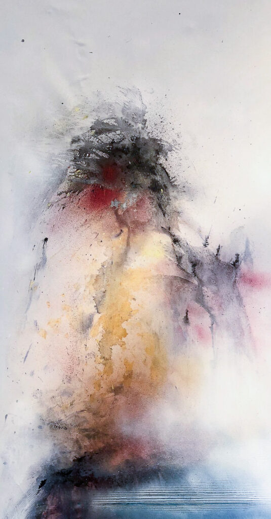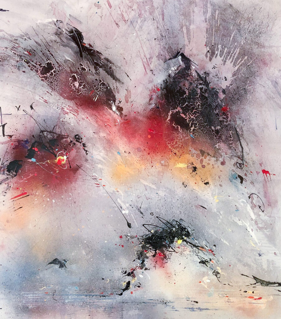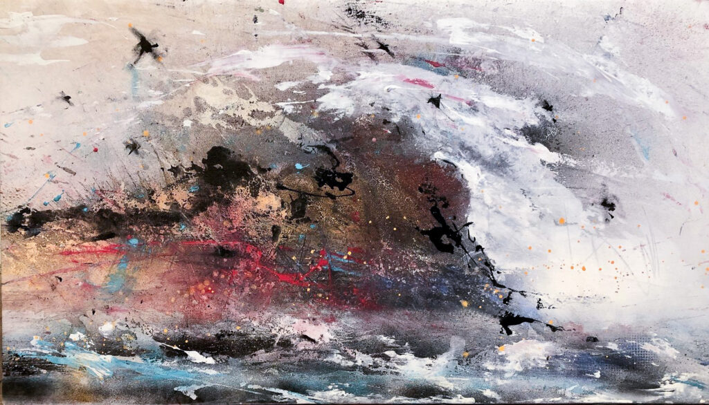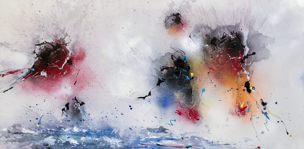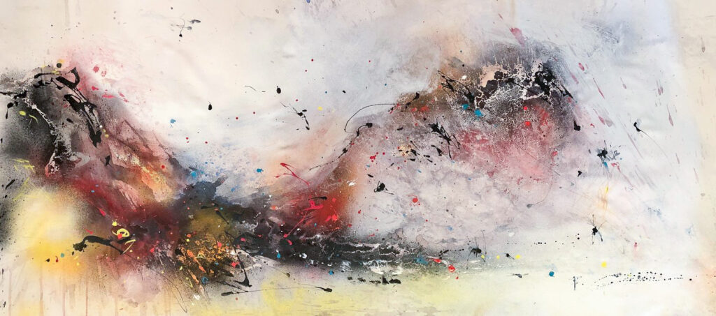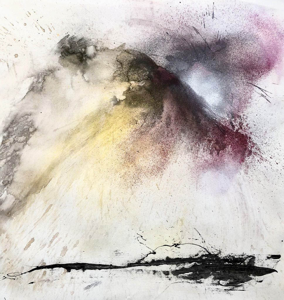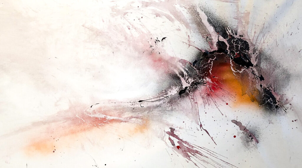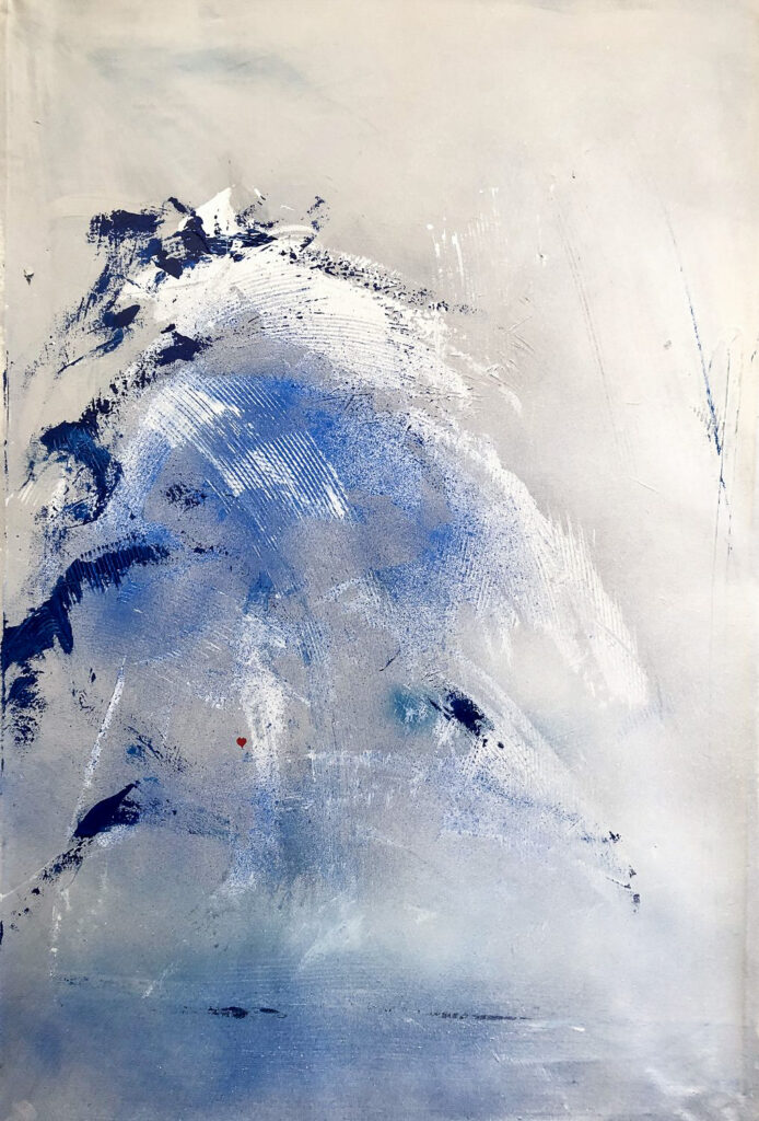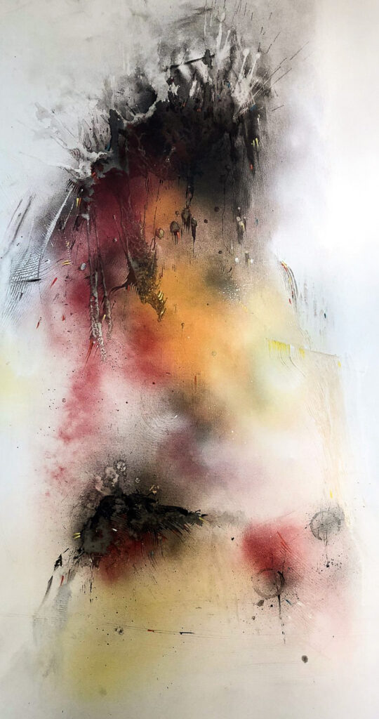 Les tableaux « SANSUI » veulent posséder l’esprit de l’eau et recréent, – par les pulsations sanguines qui motivent ce lien – la vivacité de tous ses mouvements, la manière dont les vagues se heurtent ou se succèdent, dont elles s’incarnent en de multiples formes fantastiques, tantôt agitées, tantôt apaisées. Ils mettent en lumière l’expérience directe et intuitive et communiquent par-delà les mots et les images pour faire ressentir le mouvement de la vie et la force spirituelle contenue dans chaque chose. Ils s’imprègnent de l’odeur et des sons que l’on retrouve le long des cours d’eau, des fleuves et des océans, de la vie en mouvement. Par les vents et les nuages sonder les mutations imprévisibles d’un lieu ; par l’agencement des pics et des falaises déchiffrer le secret caché qui avive le souffle dynamique et maîtriser la forme et l’esprit ; capter la vie qui se forme et s’éveille, s’ouvre, se détourne, s’incline ou se fane; saisir les secrets qui l’animent. Voilà autant de sujets qui m’inspirent. La métaphore fait partie intégrante de la pensée secrète qui les compose. Dans le plus grand abandon, le pinceau suit les mouvements giratoires du sang qui coule dans mes veines.