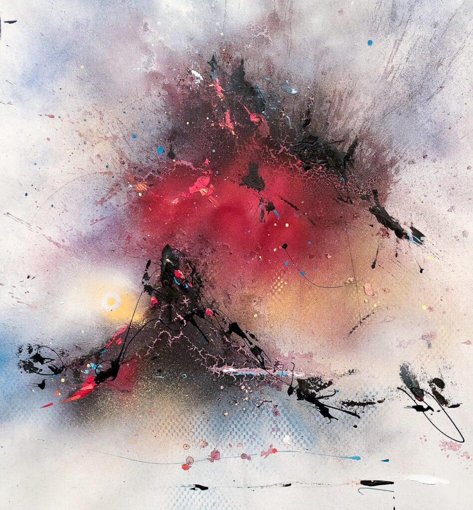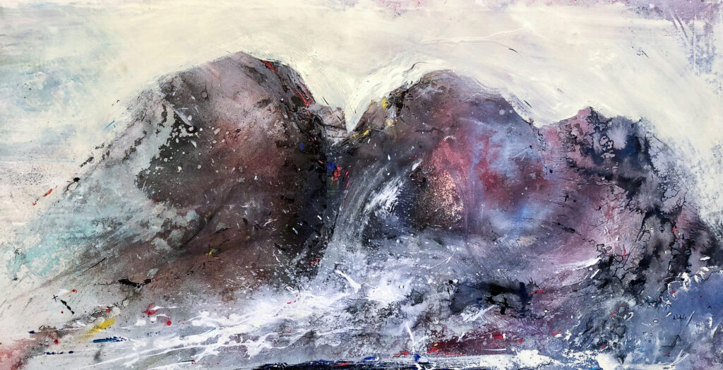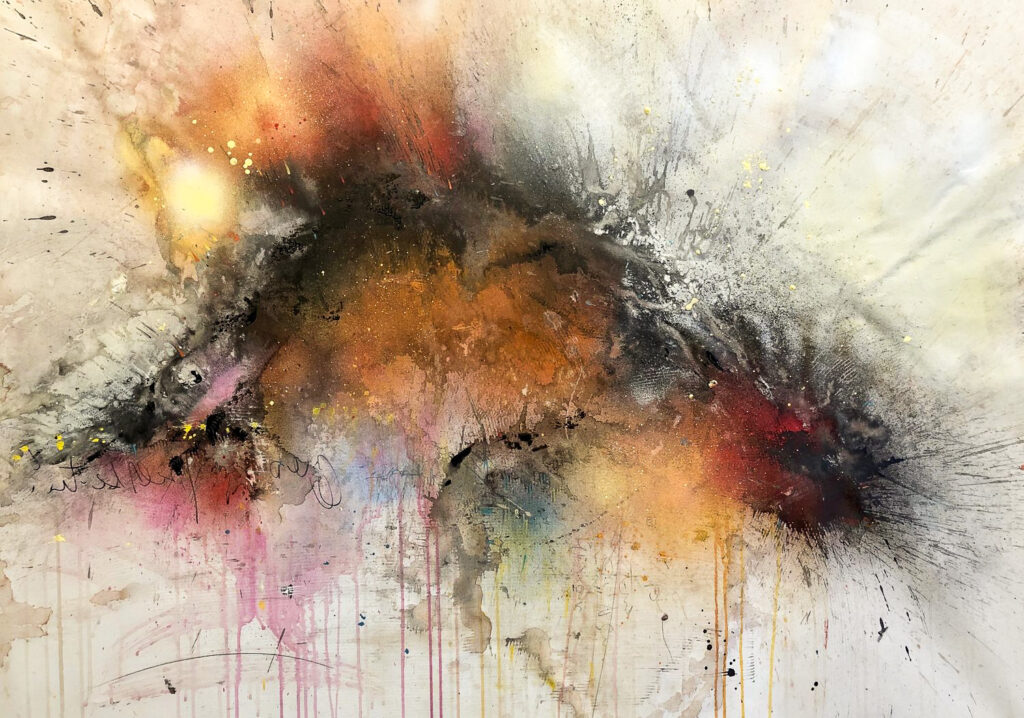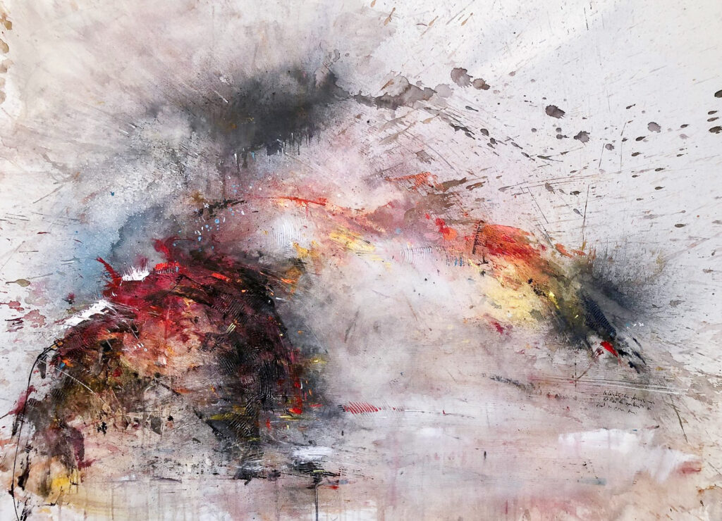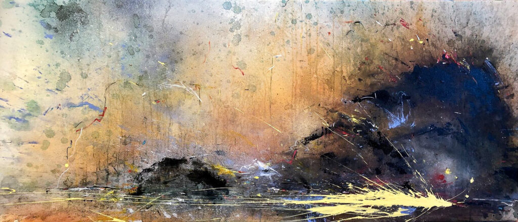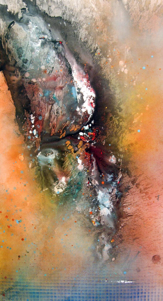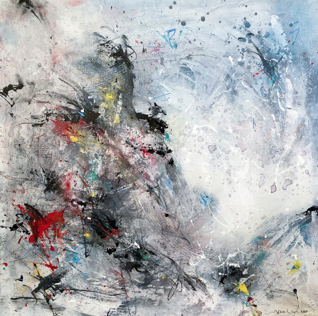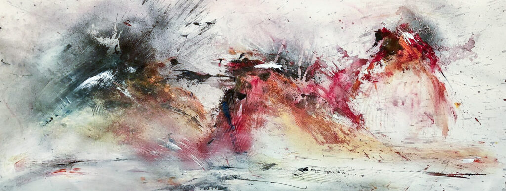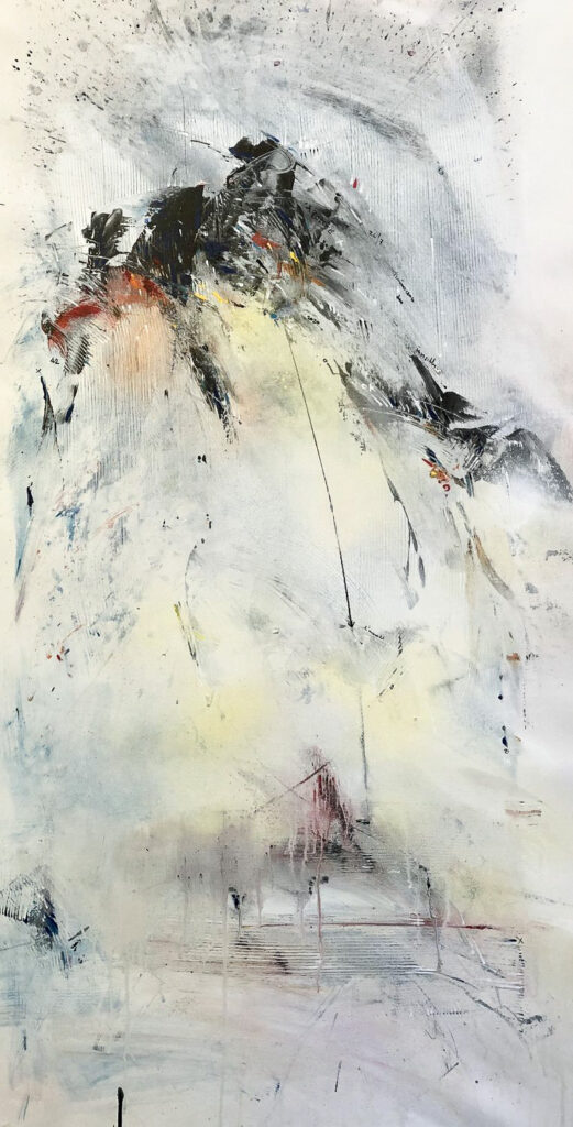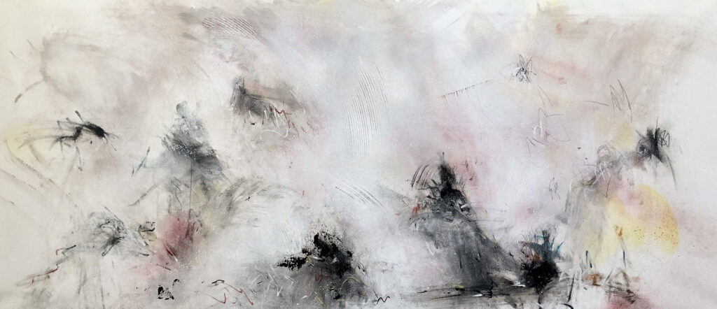 Les tableaux « SANSUI » veulent posséder l’esprit de l’eau et recréent, – par les pulsations sanguines qui motivent ce lien – la vivacité de tous ses mouvements, la manière dont les vagues se heurtent ou se succèdent, dont elles s’incarnent en de multiples formes fantastiques, tantôt agitées, tantôt apaisées. Ils mettent en lumière l’expérience directe et intuitive et communiquent par-delà les mots et les images pour faire ressentir le mouvement de la vie et la force spirituelle contenue dans chaque chose. Ils s’imprègnent de l’odeur et des sons que l’on retrouve le long des cours d’eau, des fleuves et des océans, de la vie en mouvement. Par les vents et les nuages sonder les mutations imprévisibles d’un lieu ; par l’agencement des pics et des falaises déchiffrer le secret caché qui avive le souffle dynamique et maîtriser la forme et l’esprit ; capter la vie qui se forme et s’éveille, s’ouvre, se détourne, s’incline ou se fane; saisir les secrets qui l’animent. Voilà autant de sujets qui m’inspirent. La métaphore fait partie intégrante de la pensée secrète qui les compose. Dans le plus grand abandon, le pinceau suit les mouvements giratoires du sang qui coule dans mes veines.