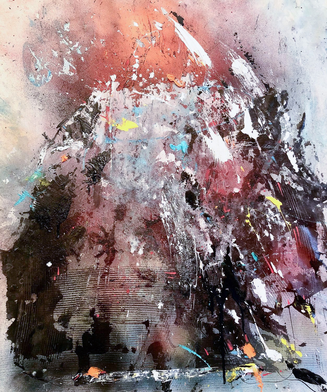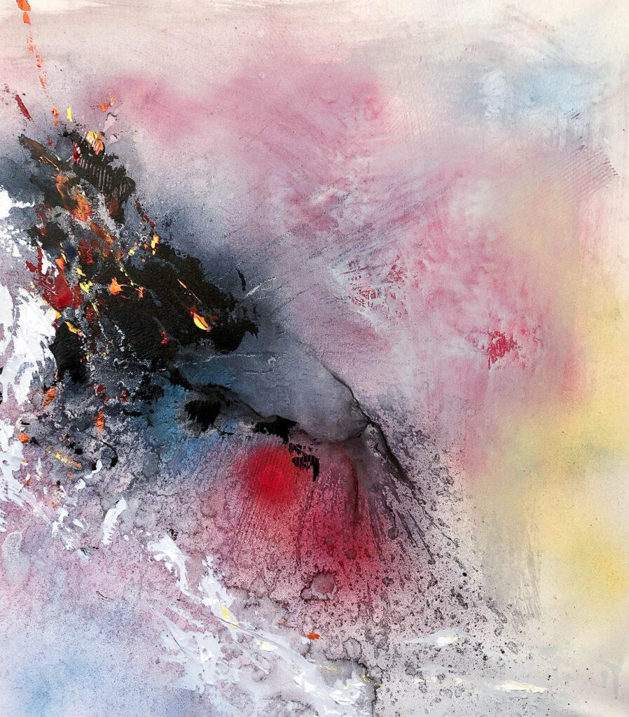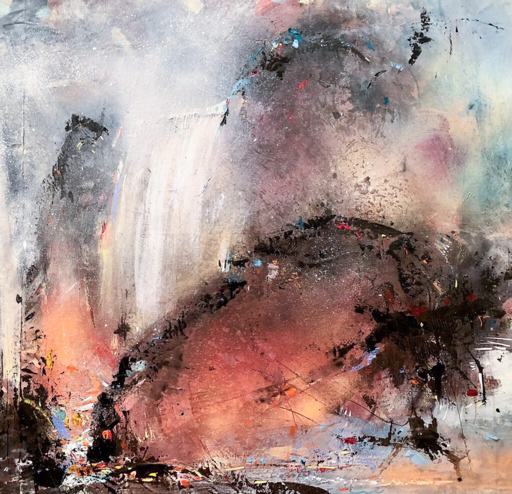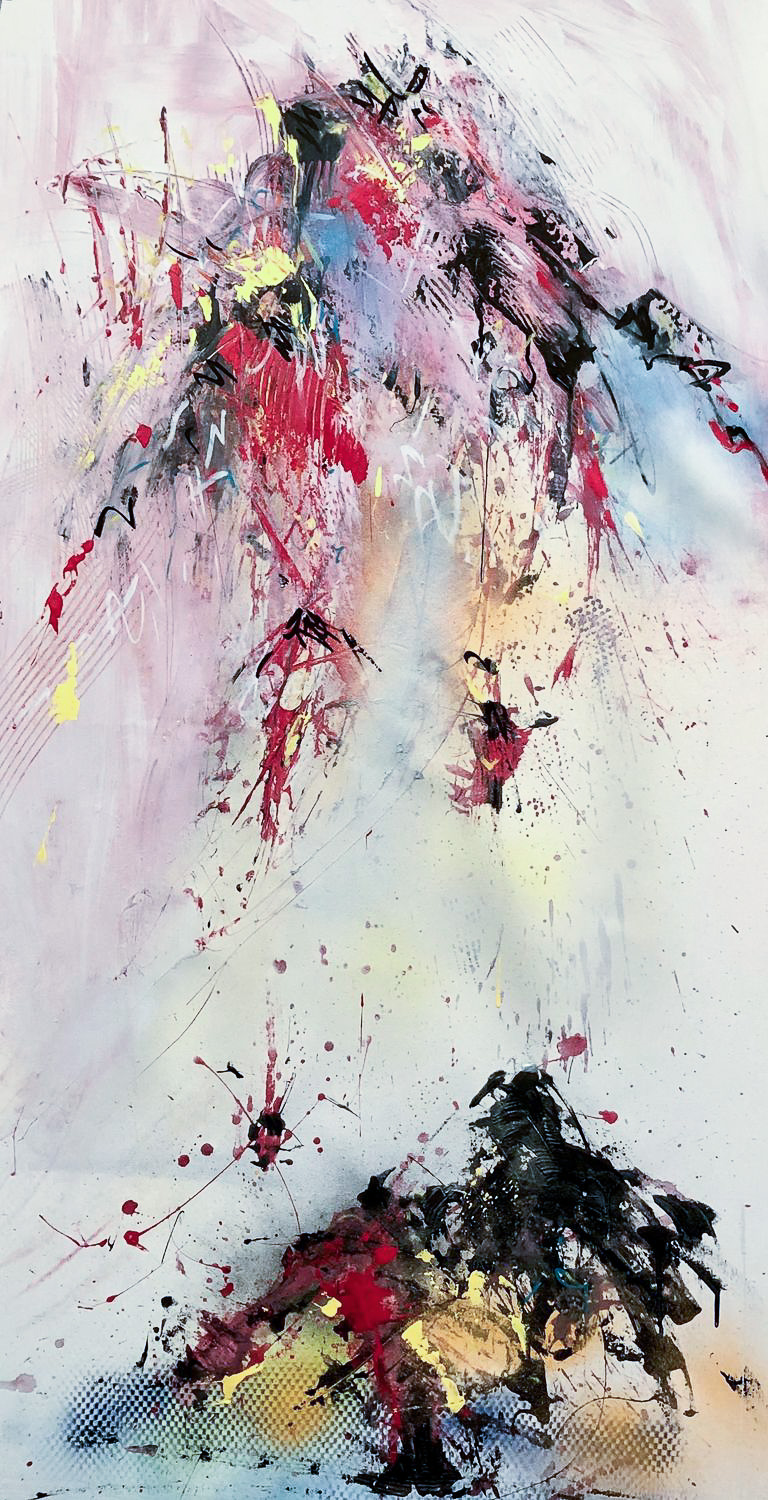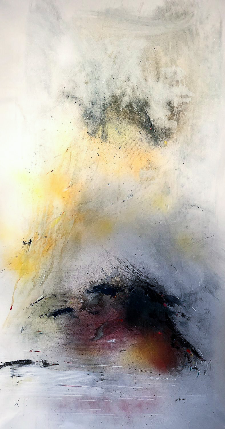 Les tableaux « SANSUI » veulent posséder l’esprit de l’eau et recréent, – par les pulsations sanguines qui motivent ce lien – la vivacité de tous ses mouvements, la manière dont les vagues se heurtent ou se succèdent, dont elles s’incarnent en de multiples formes fantastiques, tantôt agitées, tantôt apaisées. Ils mettent en lumière l’expérience directe et intuitive et communiquent par-delà les mots et les images pour faire ressentir le mouvement de la vie et la force spirituelle contenue dans chaque chose. Ils s’imprègnent de l’odeur et des sons que l’on retrouve le long des cours d’eau, des fleuves et des océans, de la vie en mouvement. Par les vents et les nuages sonder les mutations imprévisibles d’un lieu ; par l’agencement des pics et des falaises déchiffrer le secret caché qui avive le souffle dynamique et maîtriser la forme et l’esprit ; capter la vie qui se forme et s’éveille, s’ouvre, se détourne, s’incline ou se fane; saisir les secrets qui l’animent. Voilà autant de sujets qui m’inspirent. La métaphore fait partie intégrante de la pensée secrète qui les compose. Dans le plus grand abandon, le pinceau suit les mouvements giratoires du sang qui coule dans mes veines.